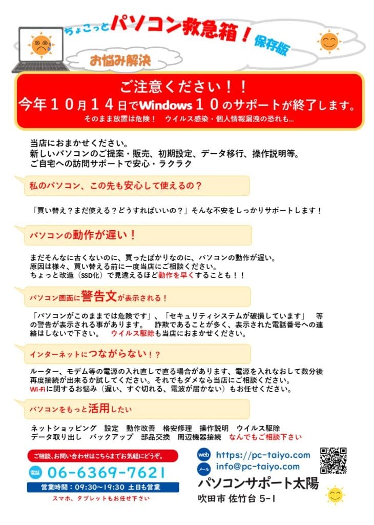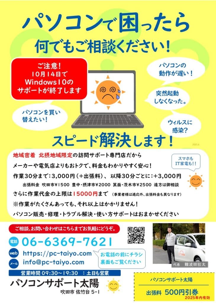 新聞折り込み広告配布しますパソコンサポート太陽 新聞折り込み広告2025年8月1日 ひさしぶりに新聞折り込み広告を配布します。8月2日土曜日読売新聞 吹田市千里地域に折り込み広告が入ります。当店が特にお勧めしているのは Windows10のサポート終了に関するのせかえ提案とパソコンの動作不良(動作の遅さ)の改善です。